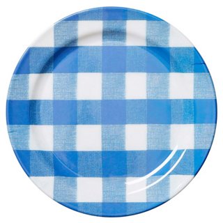 Reusable blue & white gingham checkered picnic/dinner plate, 9 inch melamine, set of 4.